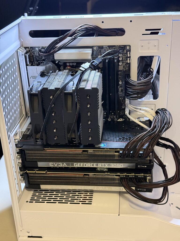 As you can see above, after the CPU cooler and the GPU’s were installed you can barely see the motherboard. Although there are still PCIe slots available, there is no more room to actually place new PCIe cards. We still have two more DIMM slots, so we can consider a future memory upgrade.