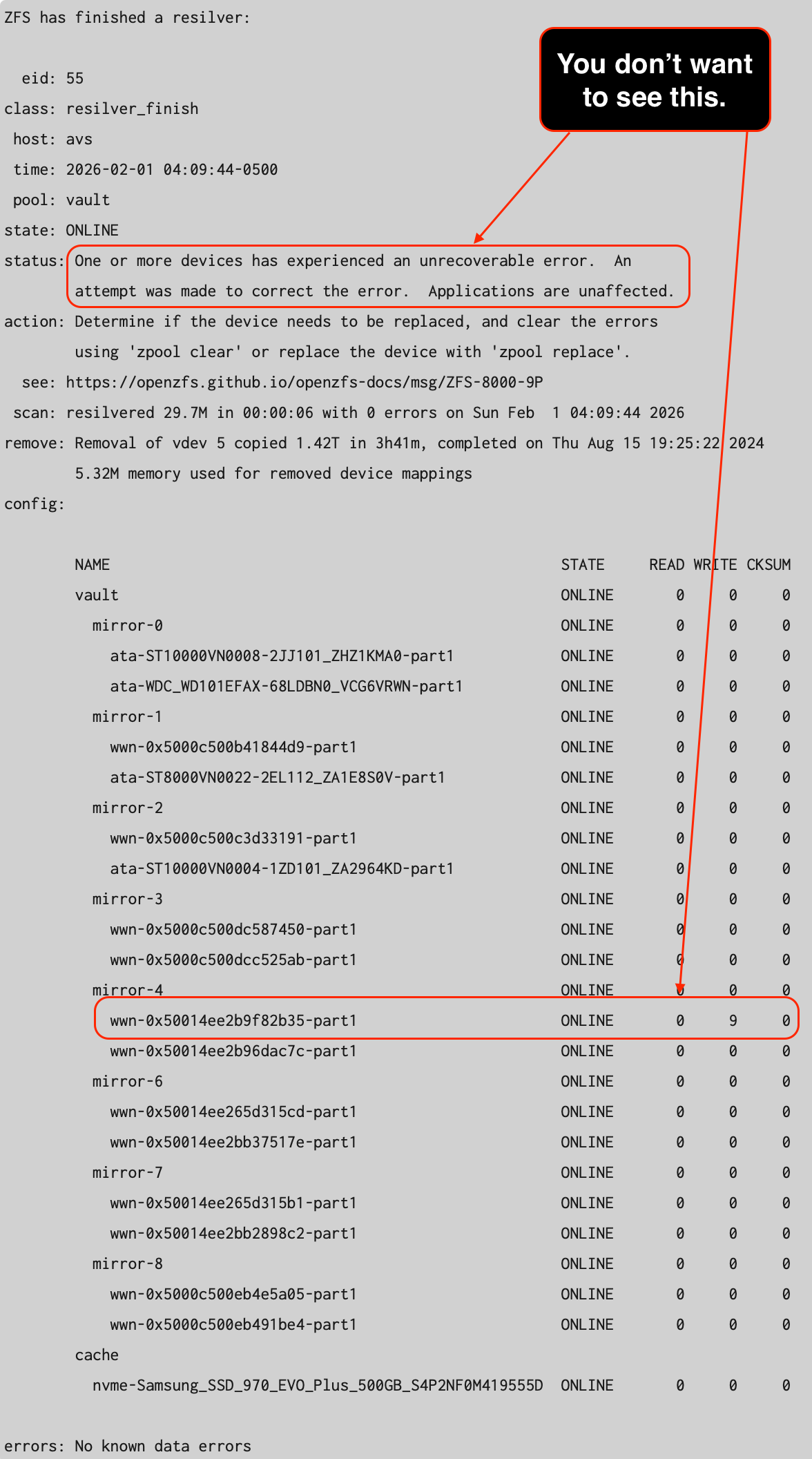 In a previous post, I discussed creating a brand new VDEV with new drives to replace an existing VDEV. However, there is another approach that I chose to use in a very recent event for my NAS (Network Attached Storage) hard drive when it started to encounter write errors and later checksum errors.
