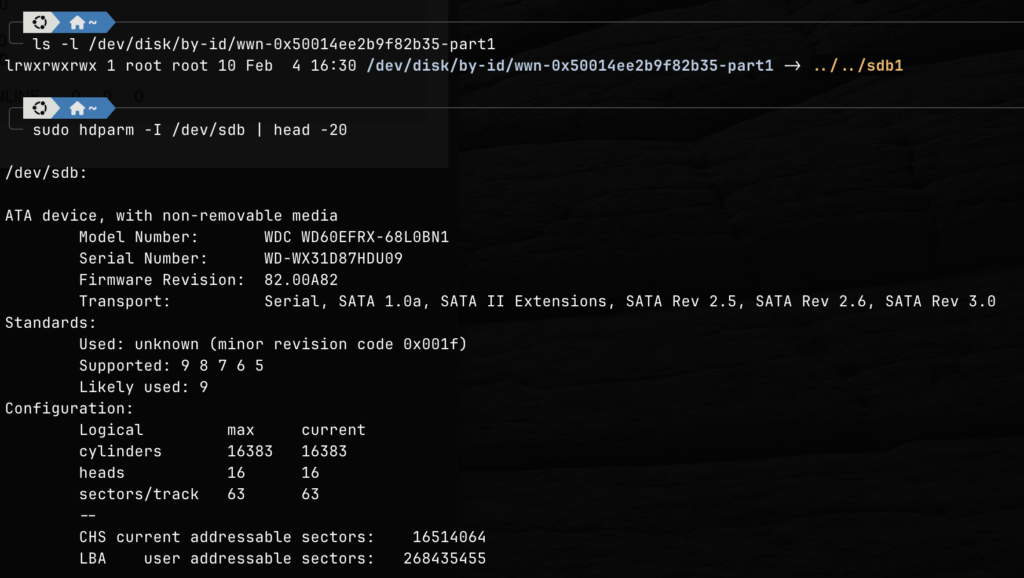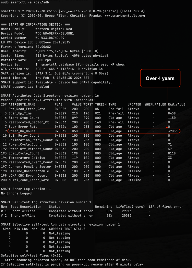 It was the WD60EFRX drive that failed. This is a WD60EFRX Western Digital Red 6TB 5400RPM drive. I was curious to see how old is the drive, so I used the smartctl utility to find out the number of powered on hours that this particular drive endured.