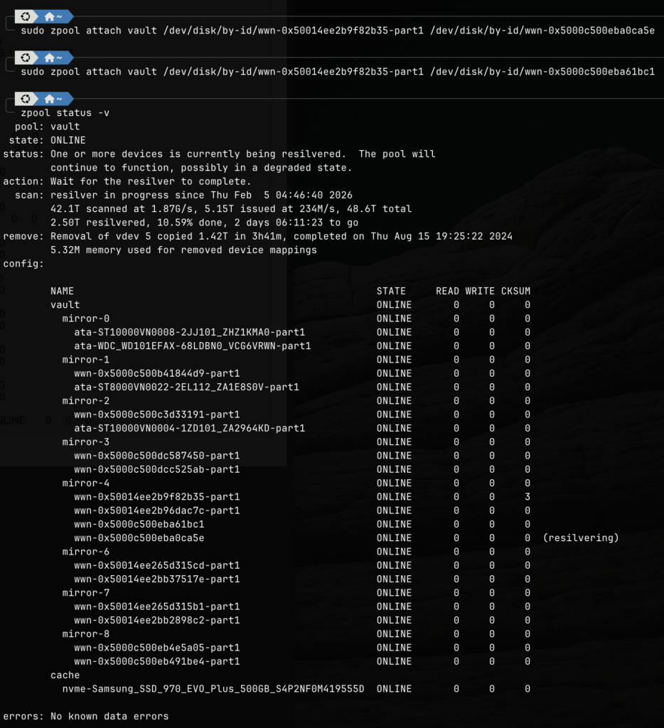 After attaching the new drives, the zfs pool begins to automatically resilver. The above image was taken several hours after the attachment, and we are now waiting for the last drive to complete its resilvering. Since one of the new drive has already completed its resilvering, this means we have regained full redundancy.