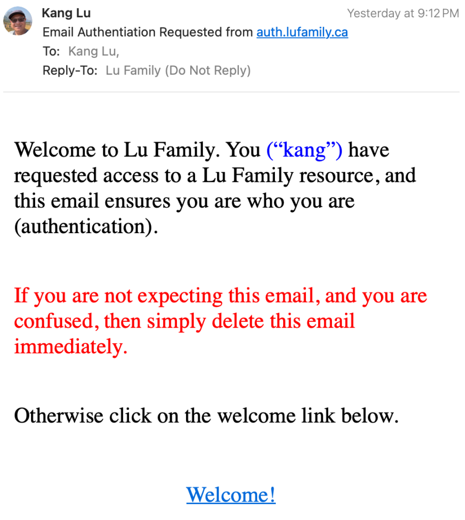 In the end, I deployed this custom identity service on auth.lufamily.ca. This custom service also handled the email authentication flow, which goes something like this: