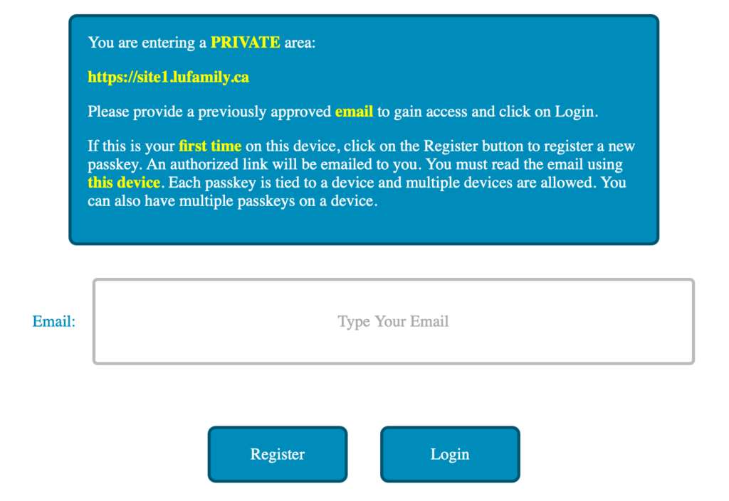 I went about to develop my own identity provider server using the python WebAuthn package. Why did I develop my own solution and instead of using one of the open source solution? I wanted to learn how this works, and what better way to do it than implementing my own version. I also wanted to customize it based on a list of authorized email with the ability to track and manage the access.