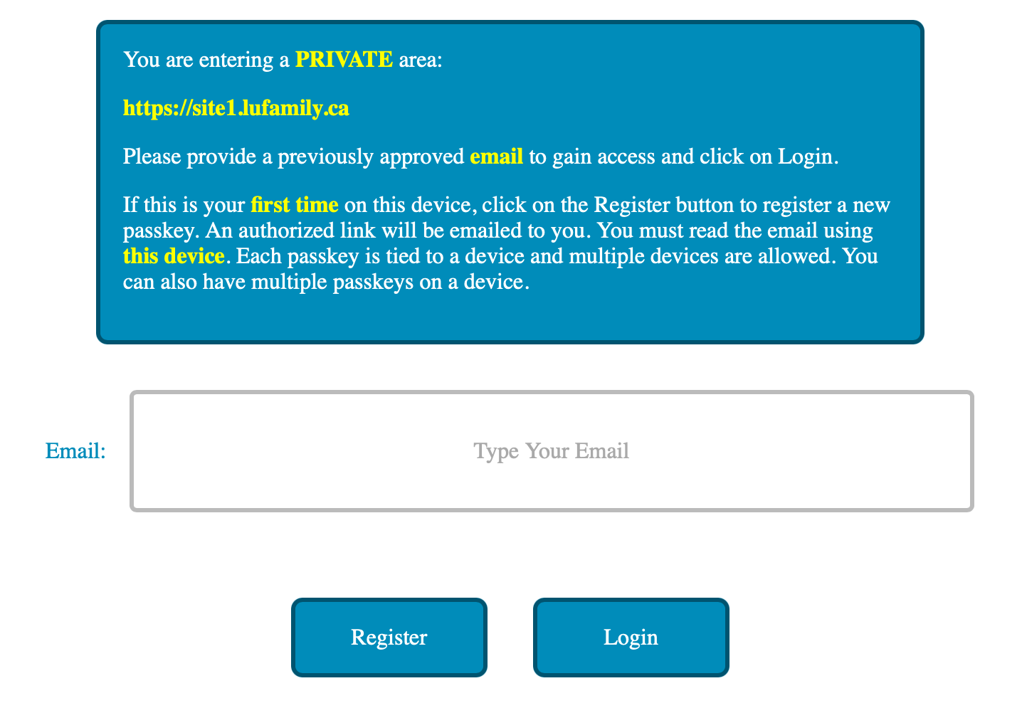 I went about to develop my own identity provider server using the python WebAuthn package. Why did I develop my own solution and instead of using one of the open source solution? I wanted to learn how this works, and what better way to do it than implementing my own version. I also wanted to customize it based on a list of authorized email with the ability to track and manage the access.